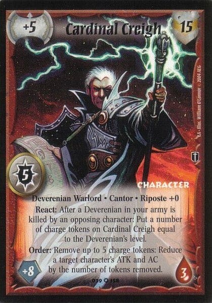 React: After an opposing character kills a Deverenian in your army: Put a number of Charges on Cardinal Creigh equal to the killed Deverenian's Level.