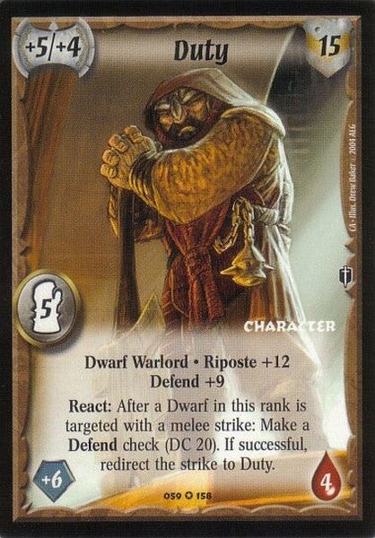 React: After a Dwarf in this rank is targeted with a melee strike: Make a Defend check (DC 20). If successful, redirect the strike to Duty.