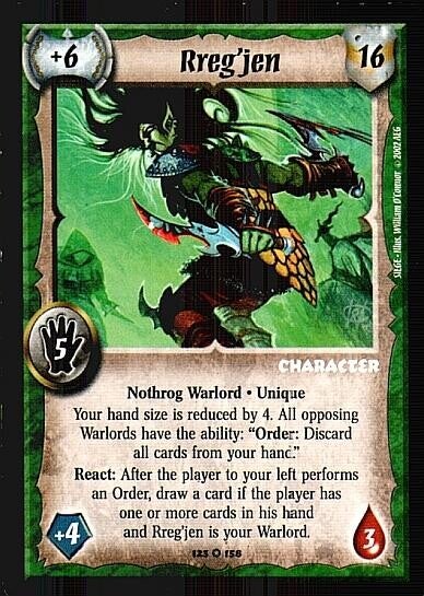 React: After the player to your left performs an Order, draw a card if the player has one or more cards in his hand and Rreg'jen is your Warlord.