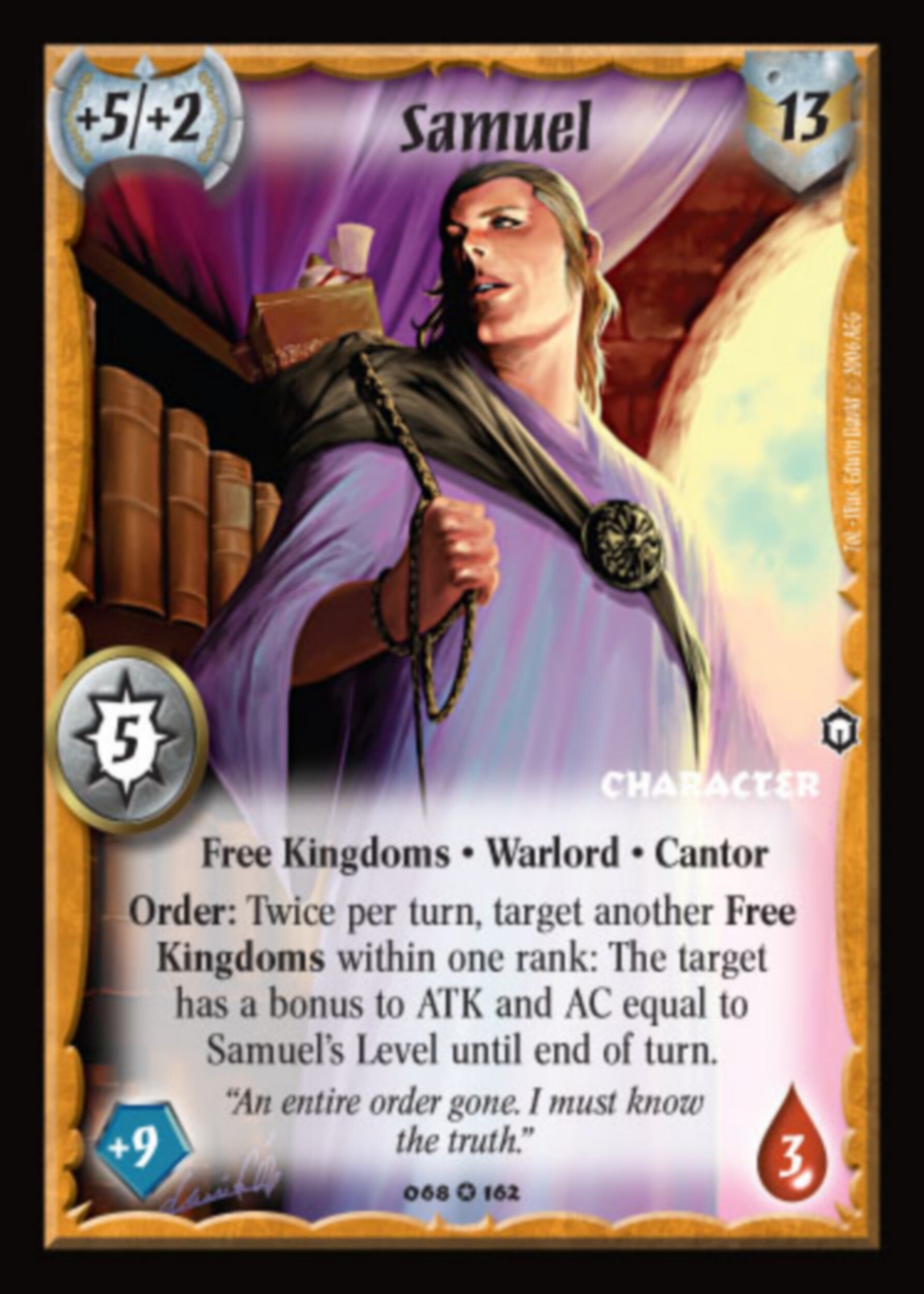 Order: Twice per turn, target another Free Kingdoms within one rank: The target has a bonus to ATK and AC equal to Samuel's Level until end of turn.