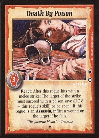 React: After this rogue hits with a melee strike: The target of the strike must succeed with a poison save (DC 8 + this rogue's skill) or be spent. If this rogue is an Assassin, inflict a wound on the target if he fails.