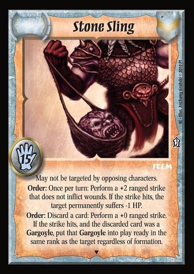 Order: Discard a card: Perform a +0 ranged strike. If the strike hits, and the discarded card was a Gargoyle, put that Gargoyle into play ready in the same rank as the target regardless of formation.