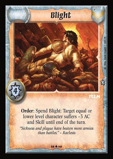 Order: Spend Blight: Target equal or lower Level character suffers -3 AC and Skill until end of the turn.