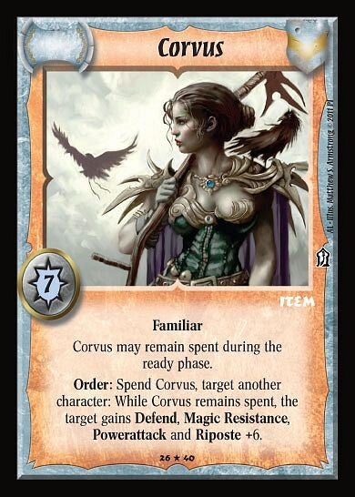 Order: Spend Corvus, target another character: While Corvus remains spent, the target gains Defend, Magic Resistance, Powerattack, AND Riposte +6.