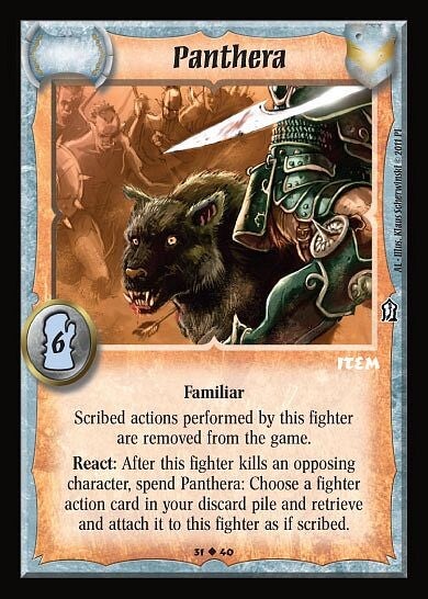 React: After this fighter kills an opposing character, spend Panthera: Choose a fighter action card in your discard pile and retrieve and attach it to this fighter as if scribed.
