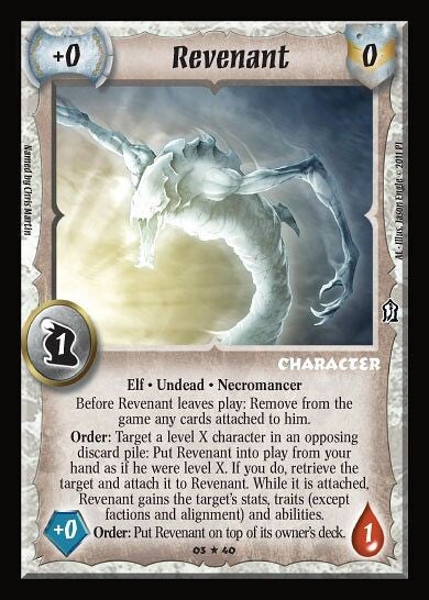 Order: Target a Level X character in an opposing discard pile: Put a Revenant into play from your hand as if he were Level X. If you do, retrieve the target and attach it to Revenant. While it is attached, Revenant gains the target's stats, traits (except factions and alignment) and abilities.