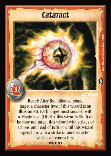 React After the initiative phase, target a character (two if this wizard is an Illusionist): Each target must succeed with a magic save (DC 8 + this wizard's Skill) or he may not target this wizard with strikes or actions until end of turn or until this wizard targets him with a strike or another action, whichever comes first.