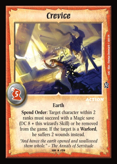 Spend Order: Target character within 2 ranks must succeed with a magic save (DC 8 + this wizard's Skill) or be removed from the game. If the target is a Warlord, he suffers 2 wounds instead.