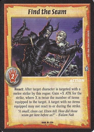 React: After target character is targeted with a melee strike by this rogue: Gain +X ATK for the strike, where X is twice the number of items equipped to the target. A target with no items equipped may not react to or during the strike.