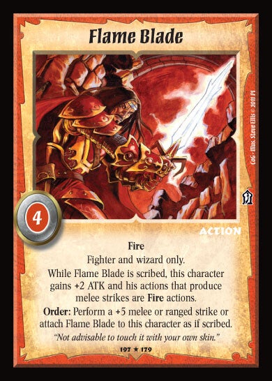 While Flame Blade is scribed, this character gains +2 ATK and his actions that produce melee strikes are Fire actions.