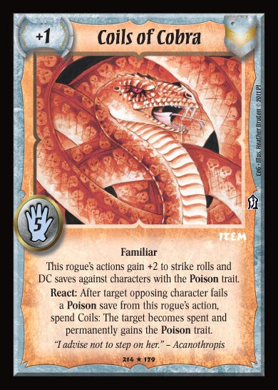 React: After target opposing character fails a Poison save from this rogue's action, spend Coils: The target becomes spent and permanently gains the Poison trait.