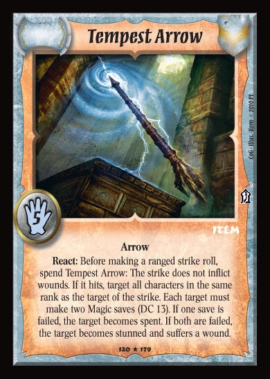 React: Before making a ranged strike roll, spend Tempest Arrow: The strike does not inflict wounds. If it hits, target all characters in the same rank as the target of the strike. Each target must make two magic saves (DC 13). If one is failed, the target becomes spent. If both are failed, the target becomes stunned and suffers a wound.