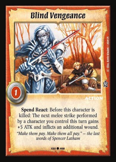 Spend React: Before this character is killed: The next melee strike performed by a character you control this turn gains +5 ATK and inflicts an additional wound.