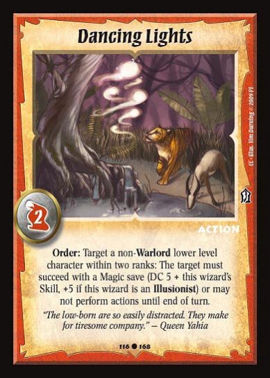 Order: Target a non-Warlord lower Level character within two ranks: The target must succeed with a magic save (DC 5 + this wizard's Skill, +5 if this wizard is an Illusionist) or may not perform actions until end of turn.