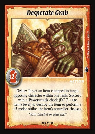 Order: Target an item equipped to target opposing character within one rank: Succeed with a Powerattack check (DC 7 + the item's Level) to destroy the item or perform a +5 melee strike, the item's controller chooses.