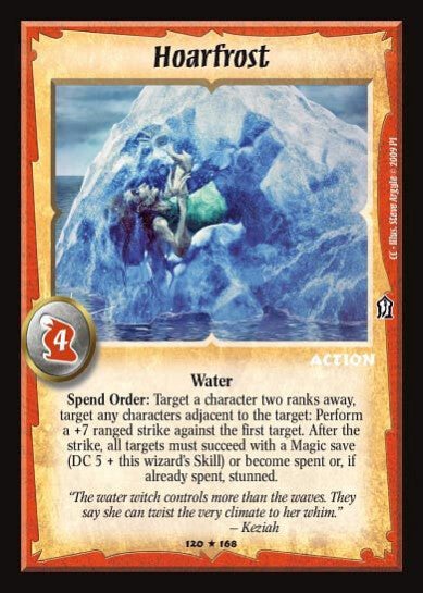 Spend Order: Target a character two ranks away, target any characters adjacent to the target: Perform a +7 ranged strike against the target. After the strike, all targets must succeed with a magic save (DC 5 + this wizard's Skill) or become spent or, if already spent, stunned.