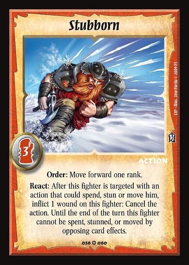 React: After this fighter is targeted with an action that could spend, stun, or move him, inflict 1 wound on this fighter: Cancel the action. Until the end of the turn this fighter cannot be spent, stunned, or moved by opposing card effects.