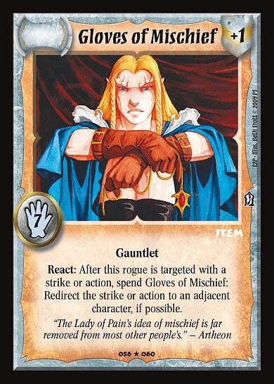 React: After this rogue is targeted with a strike or action, spend Gloves of Mischief: Redirect the strike or action to an adjacent character, if possible.