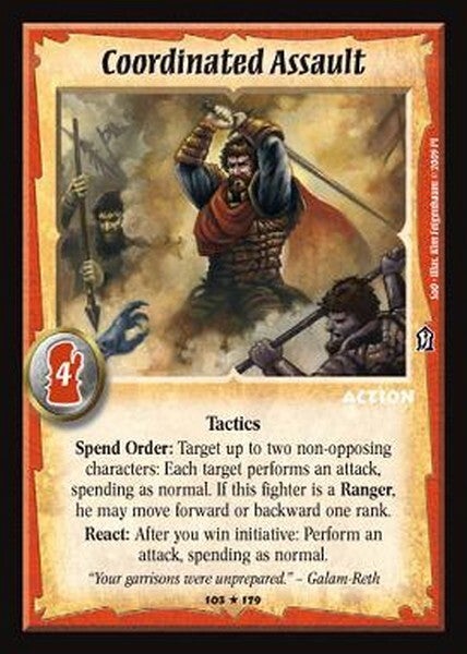 Spend Order: Target up to two non-opposing characters: Each target performs an attack, spending as normal. If this fighter is a Ranger, he may move forward or backward one rank.