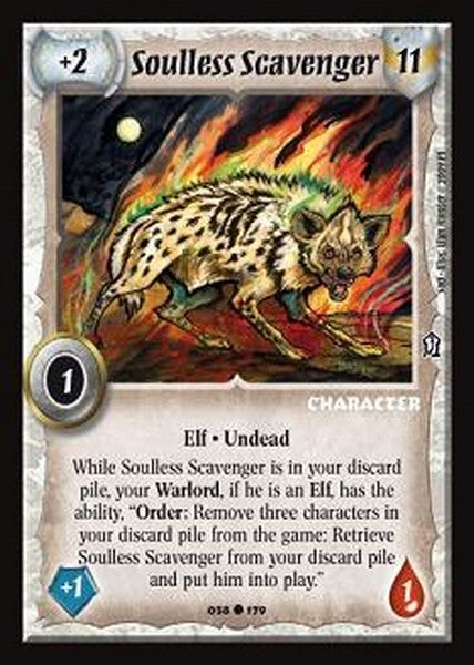 While Soulless Scavenger is in your discard pile, your Warlord, if he is an Elf, has the ability, "Order: Remove three characters in your discard pile from the game: Retrieve Soulless Scavenger from your discard pile and put him into play."