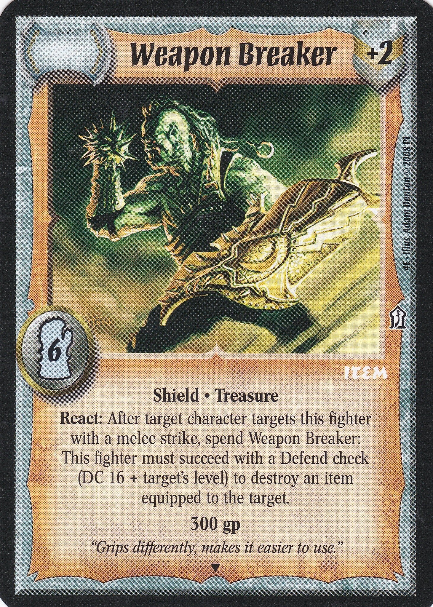 React: After target character targets this fighter with a melee strike, spend Weapon Breaker: This fighter must succeed with a Defend check (DC 16 + target's Level) to destroy an item equipped to the target.
