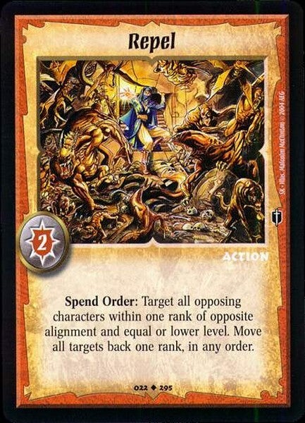 Spend Order: Target all opposing characters within one rank of opposite alignment and equal or lower level. Move all targets back one rank, in any order.