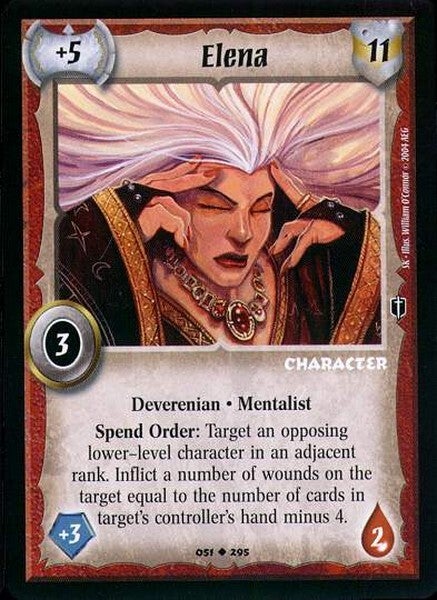Spend Order: Target an opposing lower-level character in an adjacent rank. Inflict a number of wounds on the target equal to the number of cards in target's controller's hand minus 4.