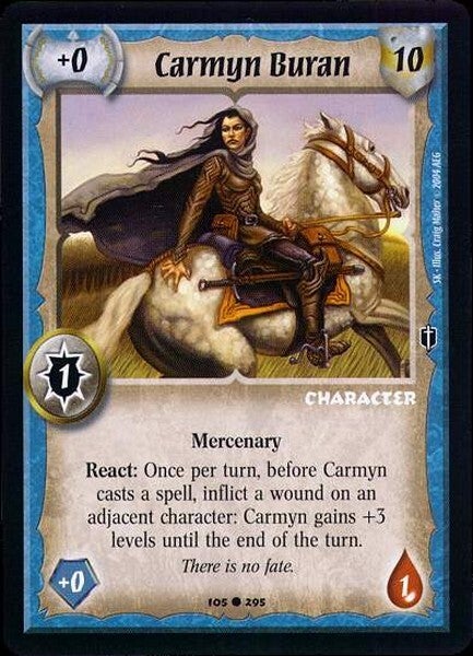 React: Once per turn, before Carmyn casts a spell, inflict a wound on an adjacent character: Carmyn gains +3 levels until the end of the turn.