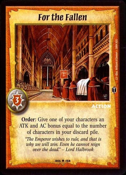Order: Target character you control has +1 ATK and +1 AC for each character card currently in your discard pile.