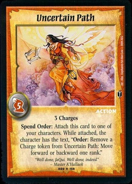 Spend Order: Attach this card to target character you control. While attached, the taget gains the ability, "Order: Remove a Charge from Uncertain Path: Move forward or backward one rank."