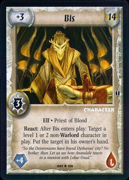 React: After Bis enters play: Return target Level 1 or 2 non-Warlord character to its owner's hand.