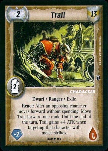 React: After an opposing character moves forward without spending: Move Trail forward one rank. Until the end of the turn, Trail gains +4 ATK when targeting that character with melee strikes.