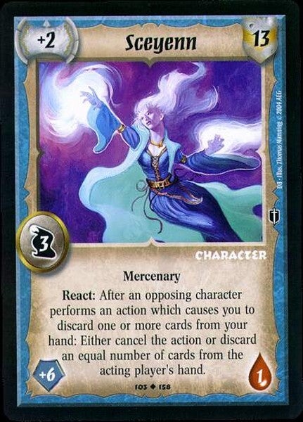 React: After an opposing character performs an action which causes you to discard one or more cards from your hand: Either cancel the action or discard an equal number of cards from the acting player's hand.