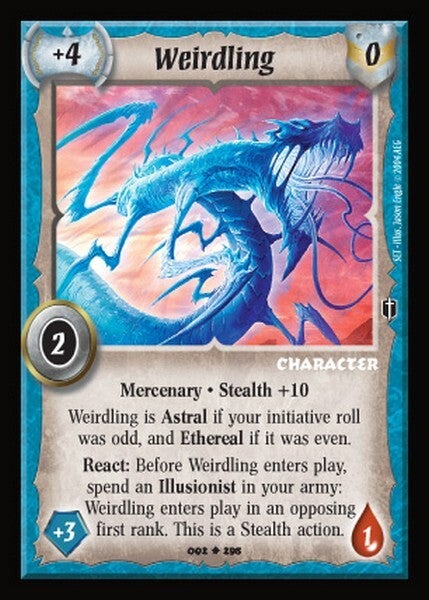 React: Before Weirdling enters play, spend an Illusionist in your army: Weirdling enters play in an opposing first rank. This is a Stealth action.