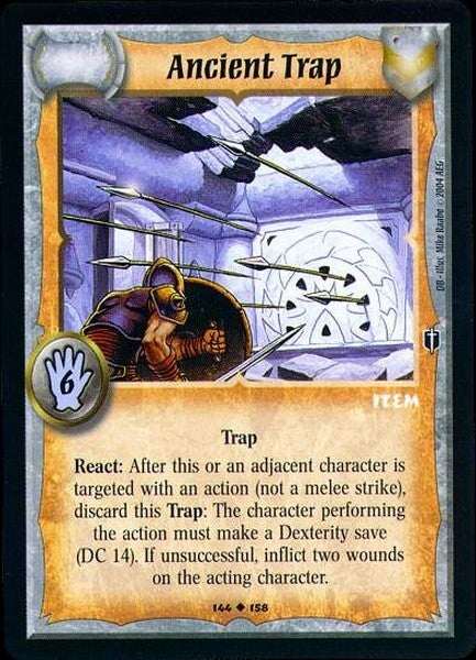 React: After this or an adjacent character is targeted with an action (not a melee strike), discard this Trap: The character performing the action must make a Dexterity save (DC 14). If unsuccessful, inflict two wounds on the acting character.
