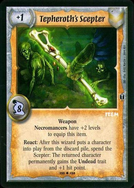 React: After this wizard puts a character into play from the discard pile, spend the Scepter: The returned character permanently gains the Undead trait and +1 hit point.