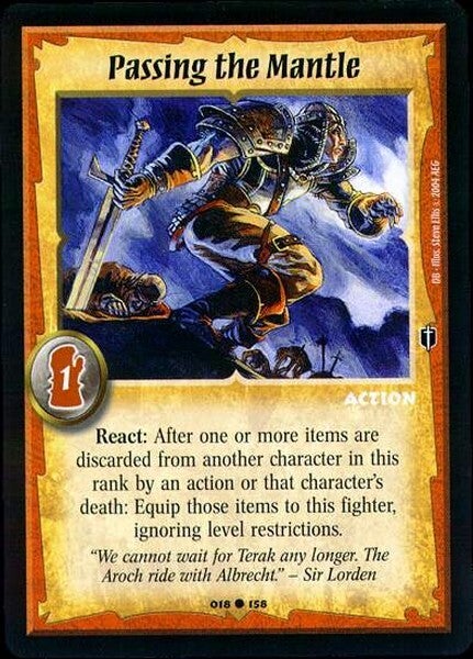 React: After one or more items are discarded from another character in this rank by an action or that character's death: Equip those items to this fighter, ignoring level restrictions.