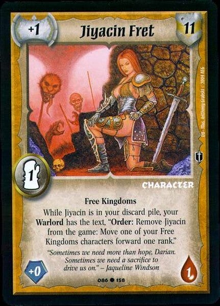 While Jiyacin Fret is in your discard pile your Warlord has the ability "Order: Remove Jiyacin Fret from the game: Move target Free Kingdoms you control forward one rank."