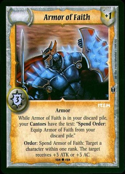 Your Cantors have the ability "Spend Order: Equip Armor of Faith from your discard pile."