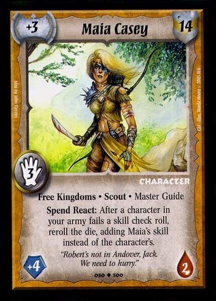 Spend React: After target character in your army makes a Skill check roll: Reroll the die, adding Maia Casey's Skill instead of the target's.