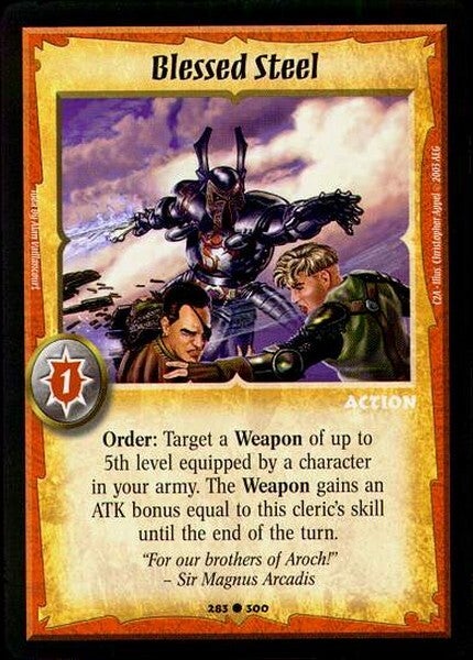 Order: Target a Weapon of up to 5th level equipped by a character in your army. The Weapon gains an ATK bonus equal to this cleric's skill until the end of the turn.