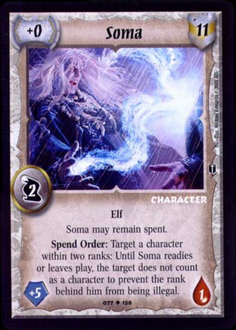 Spend Order: Target a character within two ranks: Until Soma readies or leaves play, the target does not count as a character to prevent the rank behind him from being illegal.