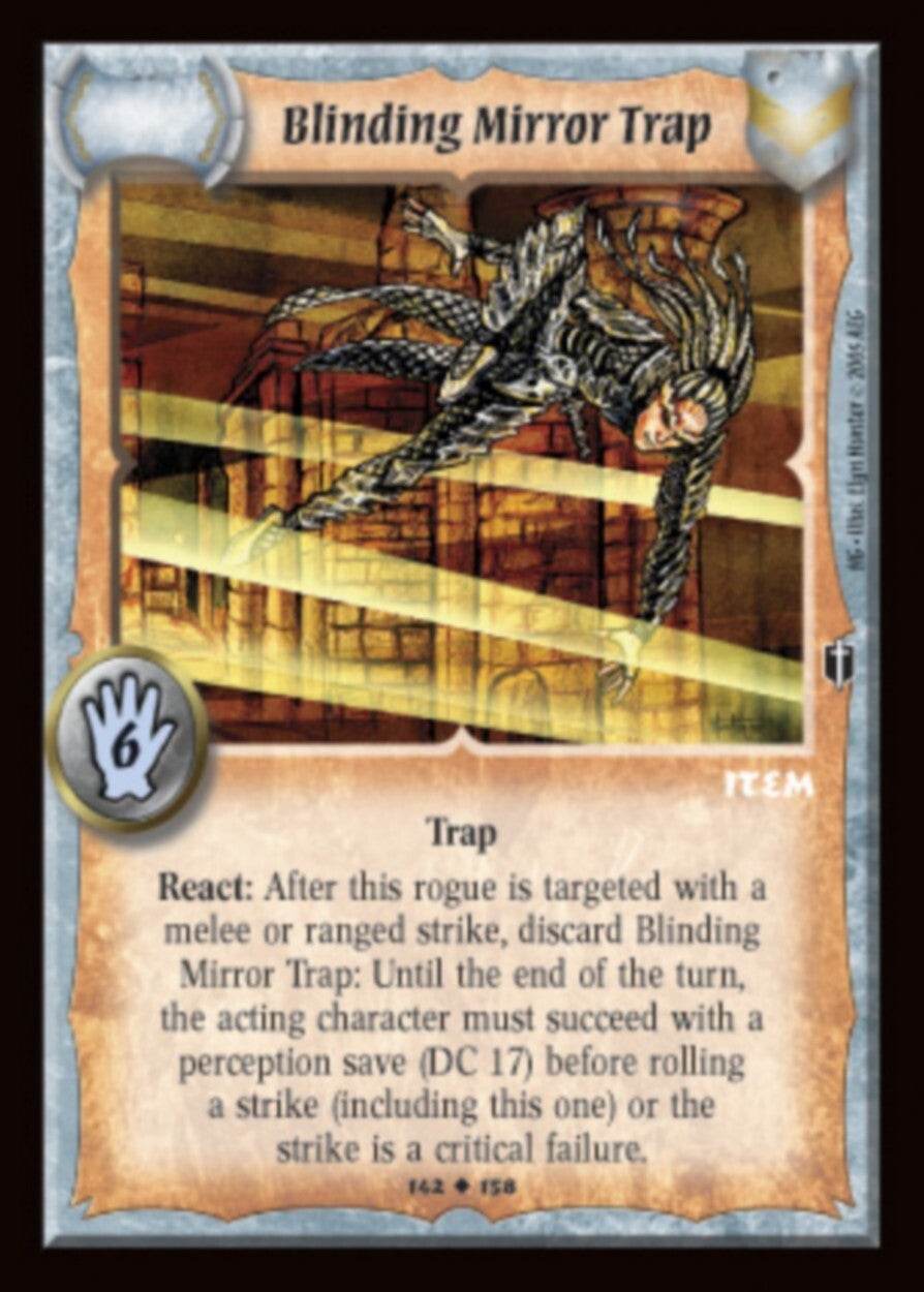 React: After this rogue is targeted with a melee or ranged strike, discard Blinding Mirror Trap: Until the end of the turn, the acting character must succeed with a perception save (DC 17) before rolling a strike (including this one) or the strike is a Critical Failure.