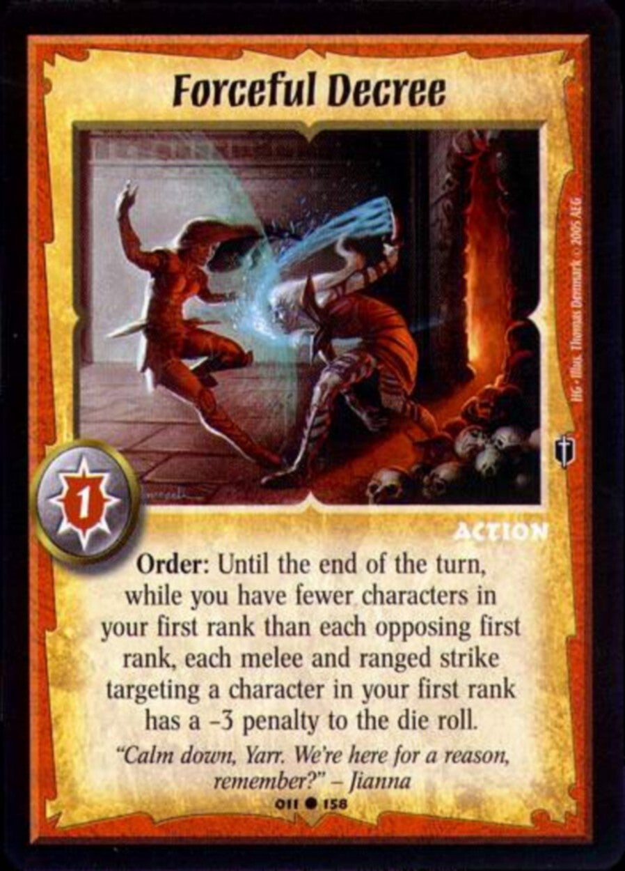 Order: Until the end of the turn, while you have fewer characters in your first rank than each opposing first rank, each melee and ranged strike targeting a character in your first rank has a -3 penalty to the die roll.