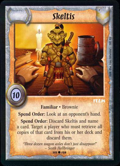 Spend Order: Discard Skeltis and name a card. Target a player who must retrieve all copies of that card from his or her deck and discard them.