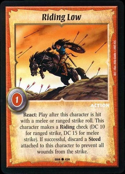 React: After this character is hit with a melee or ranged strike roll: Make a Riding check (DC 10 for ranged strike, DC 15 for melee strike). If successful, discard a Steed attached to this character: Reduce the wounds to zero.