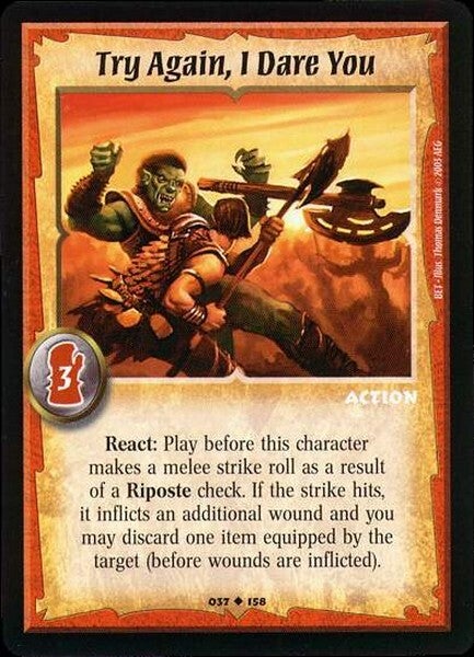 React: Play before this character makes a melee strike roll as a result of a Riposte check. If the strike hits, it inflicts an additional wound and you may discard one item equipped by the target (before wounds are inflicted).