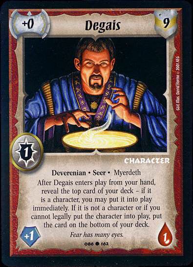 After Degais enters play from your hand, reveal the top card from your deck - if it is a character, you may put it into play immediately. If it is not a character or if you cannot legally put the character into play, put the card on the bottom of your deck.