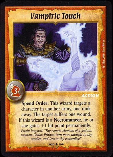 Spend Order: This wizard targets a character in another army, one rank away. The target suffers one wound. If this wizard is a Necromancer, he or she gains +1 hit point permanently.