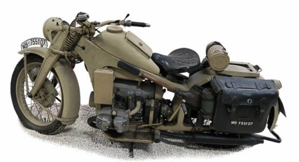 Perhaps the most famous of the 600cc class bikes deployed by the German military in WWII, the KS600 was built around a 28hp horizontally opposed engine with shaft drive. With a sidecar attached, it could reach up to 96km/h and thanks to its 15-liter fuel tank had a range of 300km. Production began in 1938, and it was used in dispatch and reconnaissance roles from the early stages of WWII; although production ceased in 1941, the remaining KS600s stayed in service until the second half of the conflict.